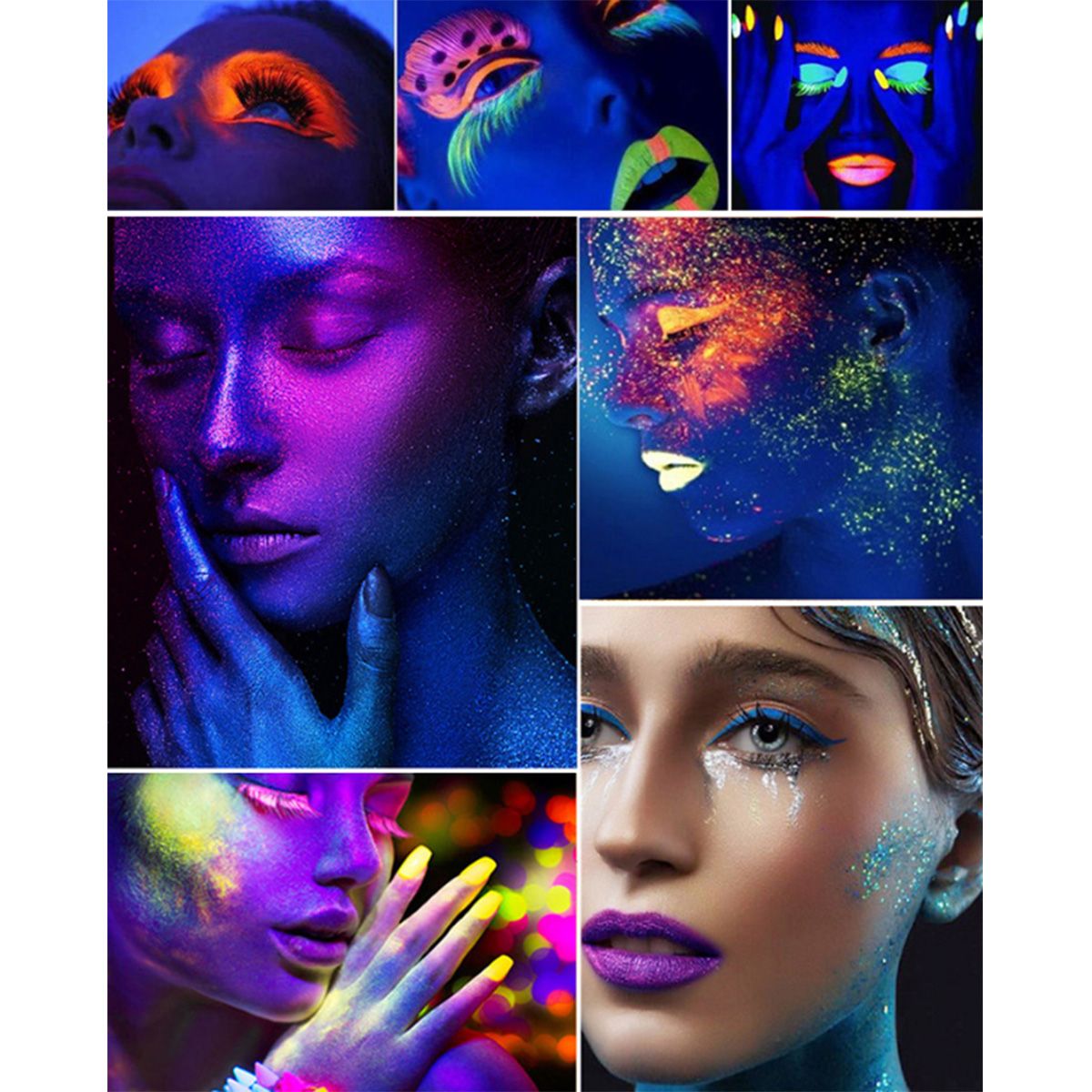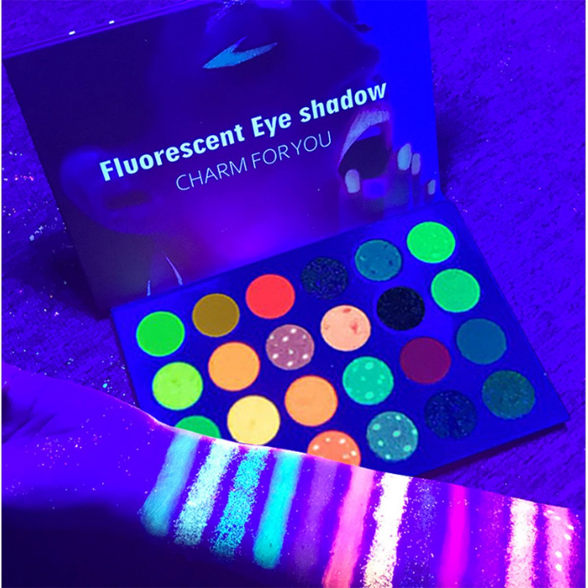 Aurora Glow Eyeshadow For Eye,Face, Body, Hair and most surfaces. 24 COLOR bright eyeshadow including 5 pentagram flaky glitters - Glow anywhere with UV light/ black light. 5 Matte shadows and 6 glitter Neon eyeshadow Glows In the dark brightly under UV (ultraviolet) lighting. Colors are beautiful and bright in normal lighting but only glow when there is UV / Blacklight. 8 colors eyeshadow in normal.